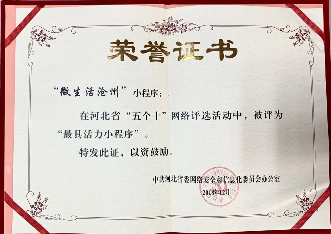 自2017年11月上線以來,得到了廣大網友的認可和關注,在團隊的精心運營下,于2018年12月份榮獲由中共河北省委網信辦主辦、河北廣播電視臺新媒體中心承辦,在全省范圍內挖掘好網絡文化產品、選樹正能量網絡人物、傳播正面主流聲音,為新時代建設經濟強省美麗河北凝聚強大網絡正能量的《河北省“五個十”網絡評選》中“最具活力小程序”榮譽。于2019年7月份榮獲由中共滄州市委網信辦和滄州市網絡媒體協(xié)會共同頒發(fā)的“滄州市2018年度優(yōu)秀新媒體(自媒體)信息傳播平臺”榮譽證書。