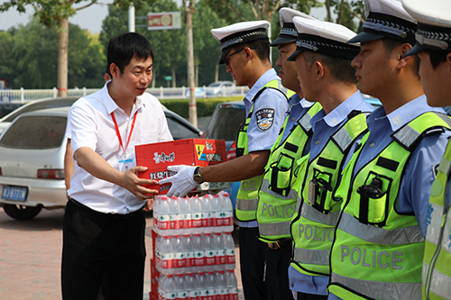 無論是寒冬的三九天還是酷夏的高溫日,他們都像一顆顆白楊挺拔的站在我們出行的路口處。霧霾嚴(yán)重的惡劣天氣、炎炎夏日的煩躁時(shí)節(jié),都有他們?yōu)槲覀兪刈o(hù)平安。在這夏至?xí)r節(jié)滄州智博信息技術(shù)有限公司自發(fā)組織了交警慰問活動(dòng),同時(shí)給五個(gè)站點(diǎn)的交警同志送去了礦泉水、冰糖雪梨、方便面、口罩等解暑物資。為滄州的交警同志送去了炎炎夏日的一絲清涼并表達(dá)了內(nèi)心的關(guān)切。